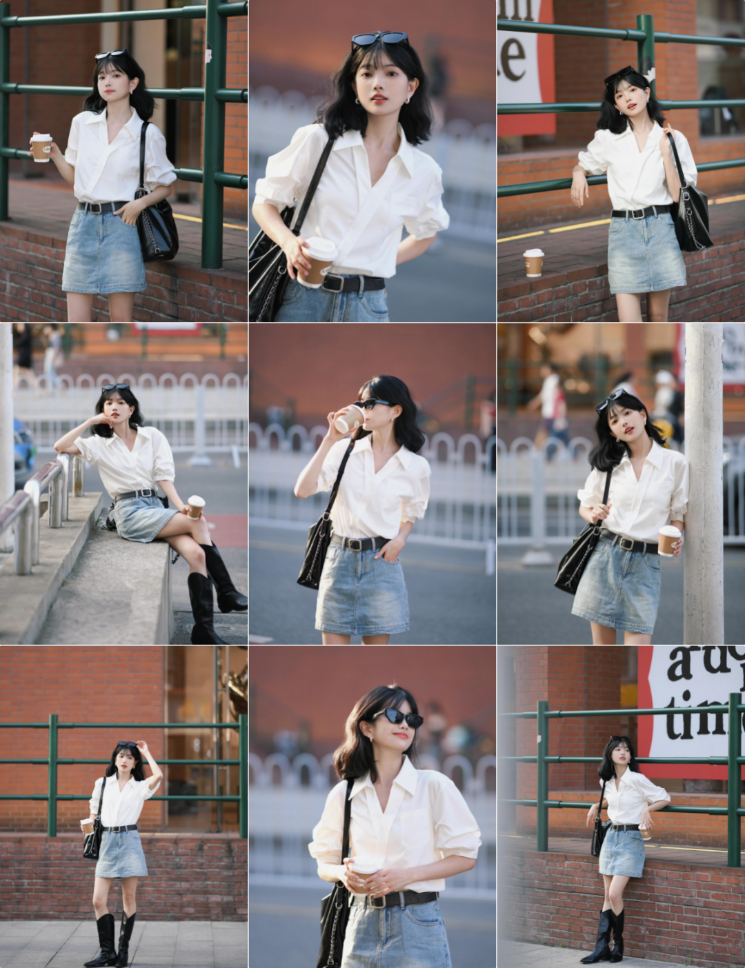 背靠着街边的栏杆或墙,轻松站着,一只手拿着咖啡,目光望向远方。这个姿势简单好操作,不看镜头更自然。加上咖啡道具,整体氛围就出来了,显得人很松弛,好看又大方。