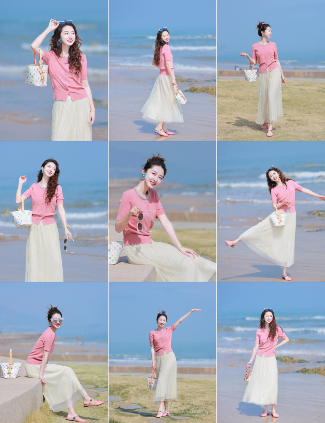 有包包和眼镜在手里,动作就不容易僵硬。穿裙子拍照,可以一手挎包,一手拿眼镜,转头看向别处,笑容自然又不做作。这样的照片不光漂亮,还特别有生活气息,很适合外出旅行拍照风格。