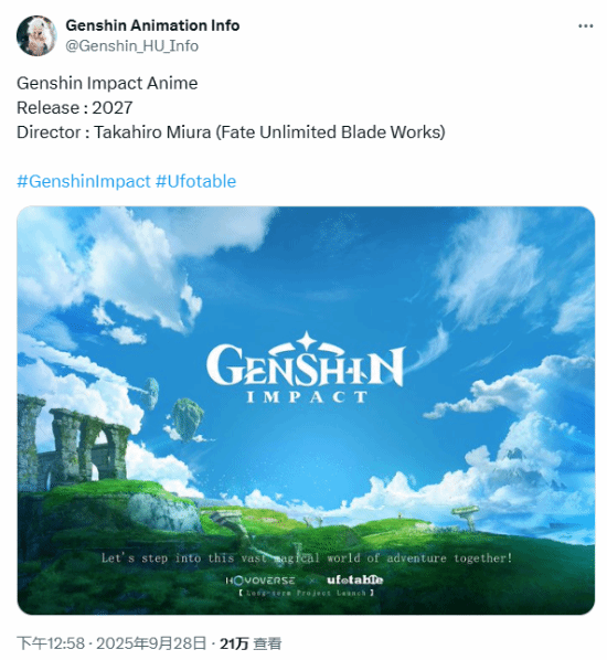 据专注于《原神》动画项目信息披露的推主@Genshin_HU_Info发布的消息可知,《原神》动画项目预计会在2027年与观众见面,该动画的导演确定为三浦贵博。