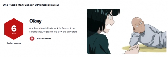 IGN简评:《一拳超人》第三季终于回归,但埼玉的回归节奏较为缓慢,且对话部分略显冗长。