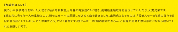主题曲确定由人气歌手友成空创作并演唱。他表示:“《暗杀教室》是陪伴我度过小学、初中时期的重要作品。继今年春季为重播版演唱片头曲之后,这次能担任剧场版主题曲的创作,我感到非常荣幸。我是与E班一同成长的一名学生,这首歌,是我写给杀老师的回礼。”