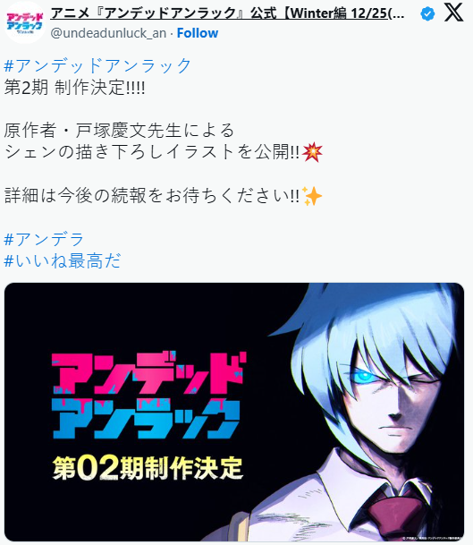 由户冢庆文创作的漫画作品《不死不幸》(アンデッドアンラック),曾于2023年10月至2024年3月改编为电视动画,凭借出色的剧情与动画表现广受好评。