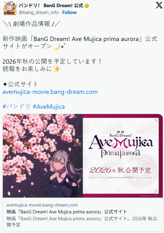 《BanG Dream! MyGO/Ave Mujica》系列自播出以来持续引发热议。续篇将以剧场版《BanG Dream! Ave Mujica prima aurora》的形式推出,预定于2026年秋季上映。关于剧情将如何展开,是否会有新团体登场,仍需等待官方后续公布进一步情报。