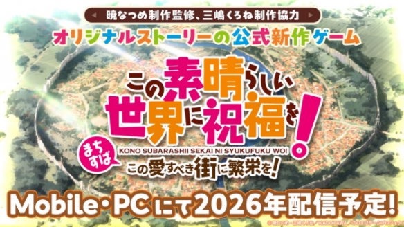 同时,官方宣布将推出一款全新手机游戏《为美好的世界献上祝福!~让这座可爱的城市更加繁荣吧!~》。该游戏由原作者晓夏目亲自监修、原作插画三嶋黑音协力制作,为官方原创故事,预计于2026年在手机与PC平台推出,官方网站现已上线。