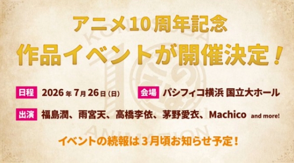 为庆祝动画十周年,官方宣布将于2026年7月26日在横滨举办大型周年纪念活动。更多参与嘉宾及详细内容预计于三月左右公布。目前已确定主要声优福岛润、雨宫天、高桥李依、茅野爱衣、Machico均将出席。