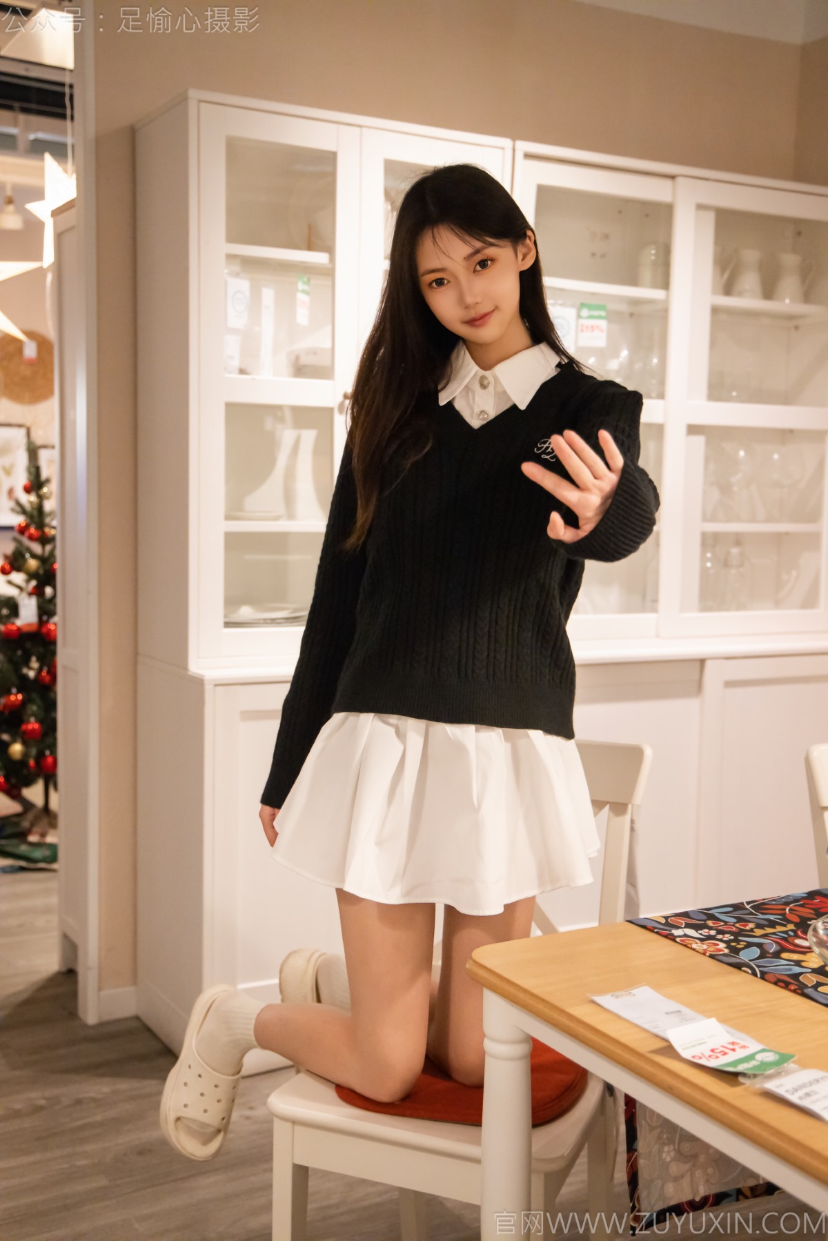 搭配内容:黑色毛衣、白色短裙、洞洞鞋、白色棉袜、裸足