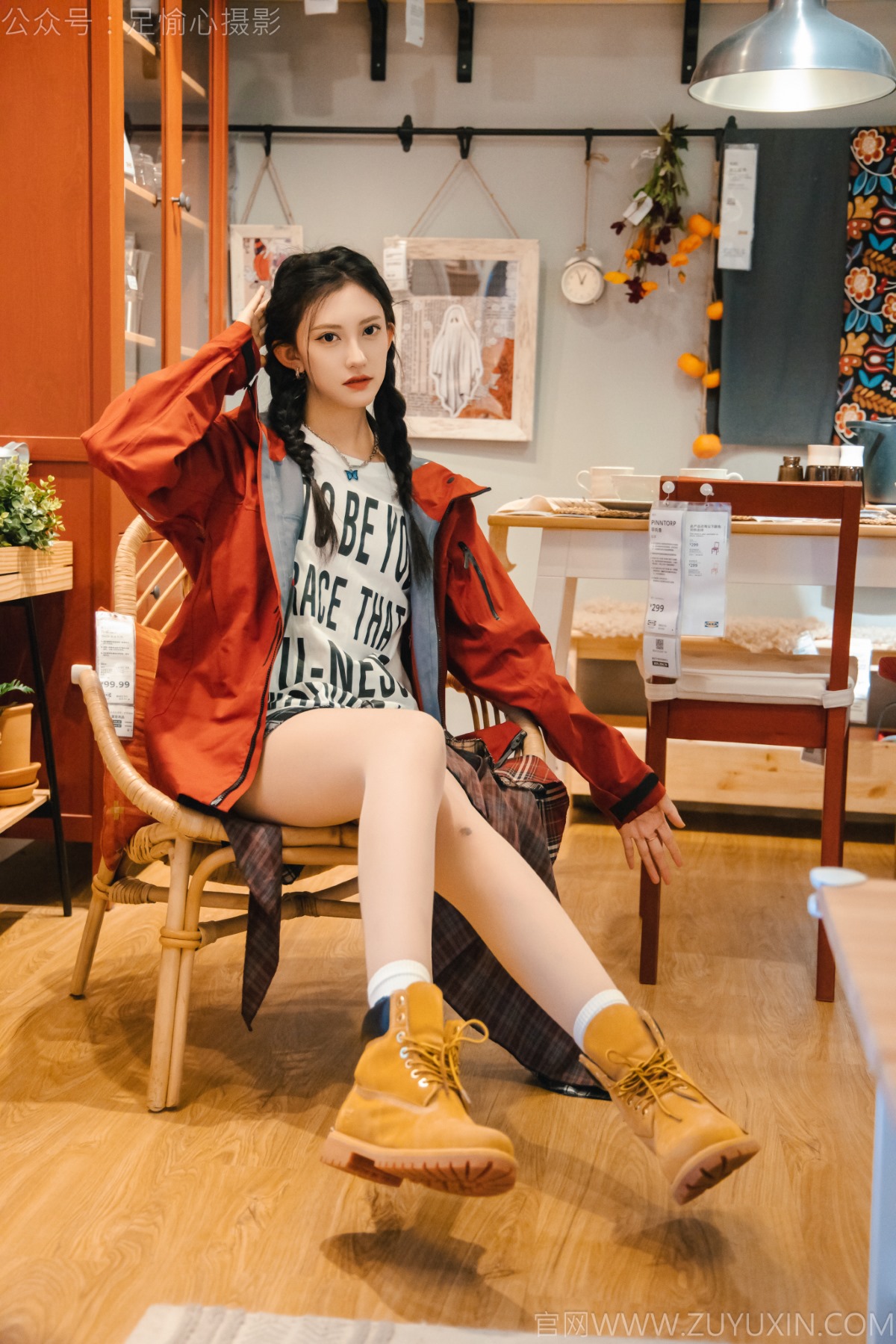 搭配内容:红色夹克、白T、短裙、马丁靴、肉丝色袜、白棉袜、裸足