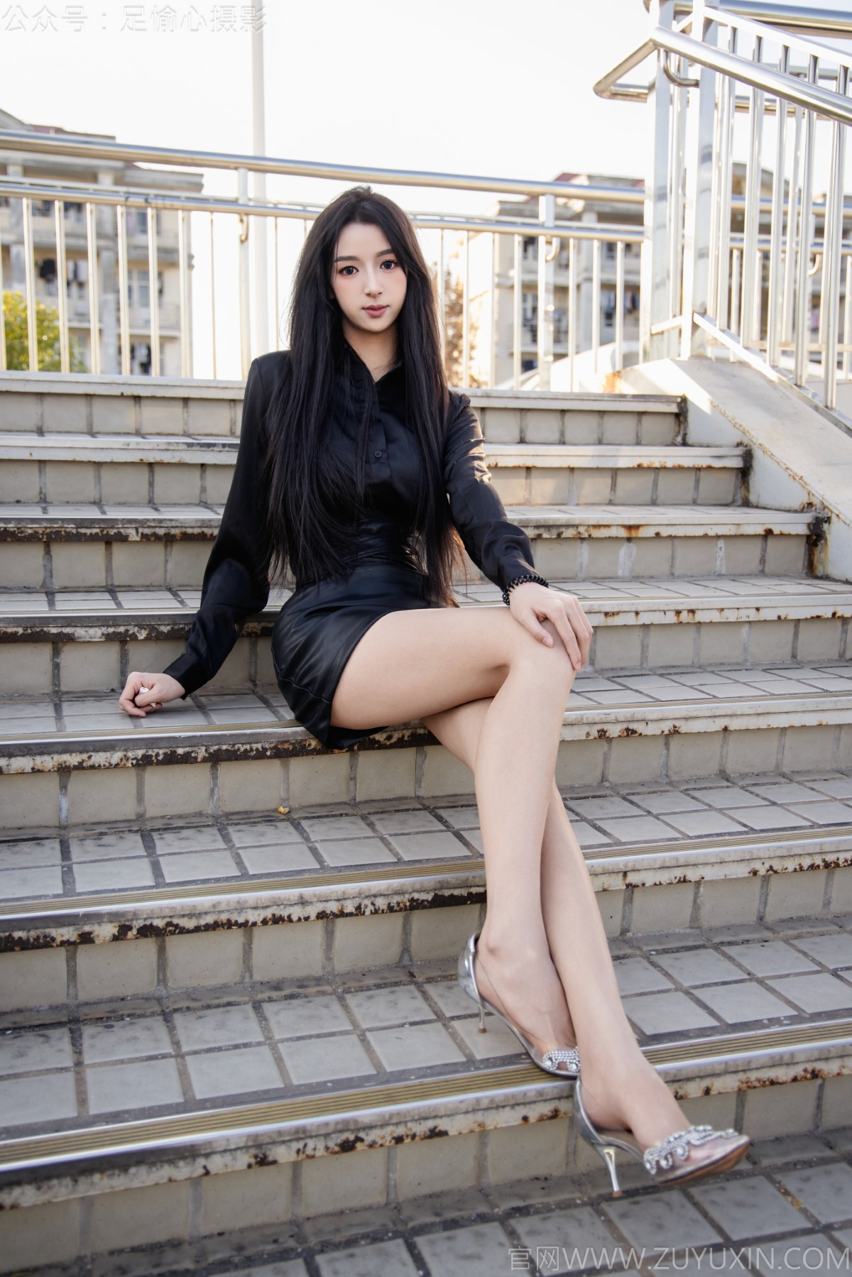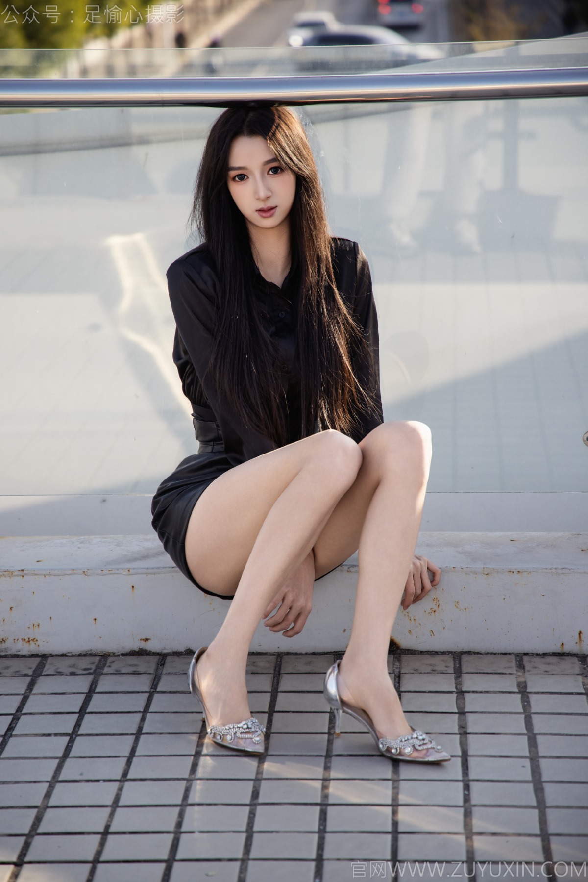 搭配内容:黑色衬衫、皮裙、高跟鞋、裸足