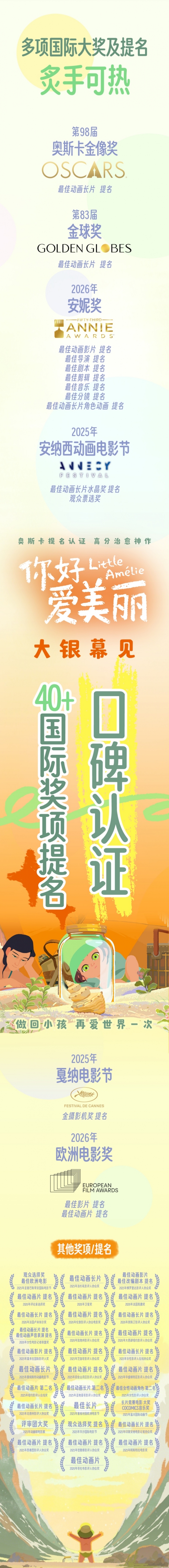 近日,第98届奥斯卡金像奖提名公布,电影《你好,爱美丽》荣获最佳动画长片提名。自去年起,《你好,爱美丽》便在多个国际电影节展中亮相并持续获得关注与肯定,截至目前,影片斩获包含奥斯卡金像奖最佳动画长片提名、金球奖最佳动画长片提名、安妮奖最佳动画影片在内的7项提名、安纳西国际动画电影节最佳动画长片水晶奖提名及观众票选奖等40余项奖项与提名,以非凡的艺术魅力在全球动画影坛中大放异彩,成为颁奖季备受瞩目的动画作品之一。电影在海外好评如潮,烂番茄新鲜度达98%,海外媒体IndieWire评价道:“这是一场独属于孩童的冥思,既歌颂生命馈赠的所有美好,也直面那些让美好更值得珍惜的逝去”。影片也曾在金鸡百花电影节与海南岛国际电影节进行了放映活动,不少观众表示很久没有观看到如此安静、轻盈,专注于情感感知的动画作品,电影独特的孩童视角与对生命最初温柔的回望深深触动了观众内心最柔软的部分。期待电影早日上映,有更多的观众能与爱美丽一起感受美好,重新拥抱世界,找到属于自己的那份感动与力量。